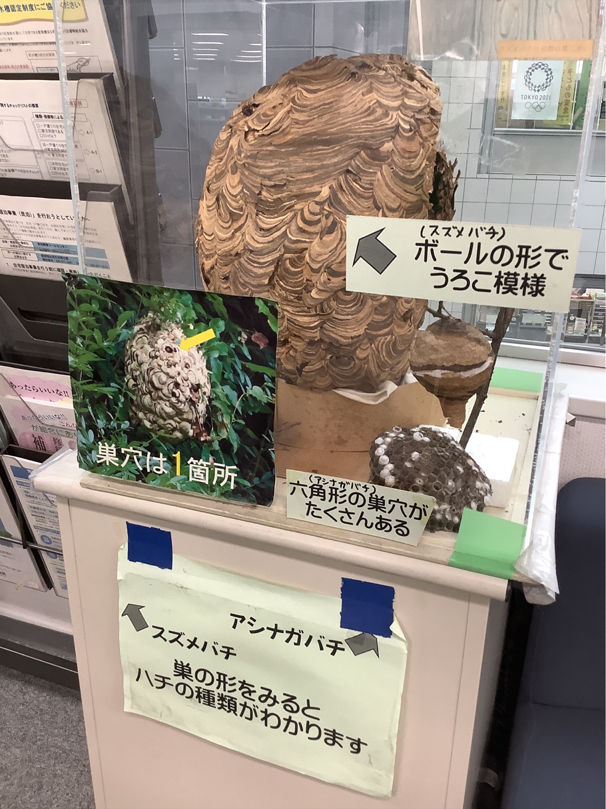 区役所では職員によるハチの巣の駆除は行っていないが、駆除の方法に関するアドバイスや駆除業者を紹介している。住宅街周辺で巣を作ることが多いのがスズメバチとアシナガバチ。巣の形状がそれぞれ異なり、見分けることができる。