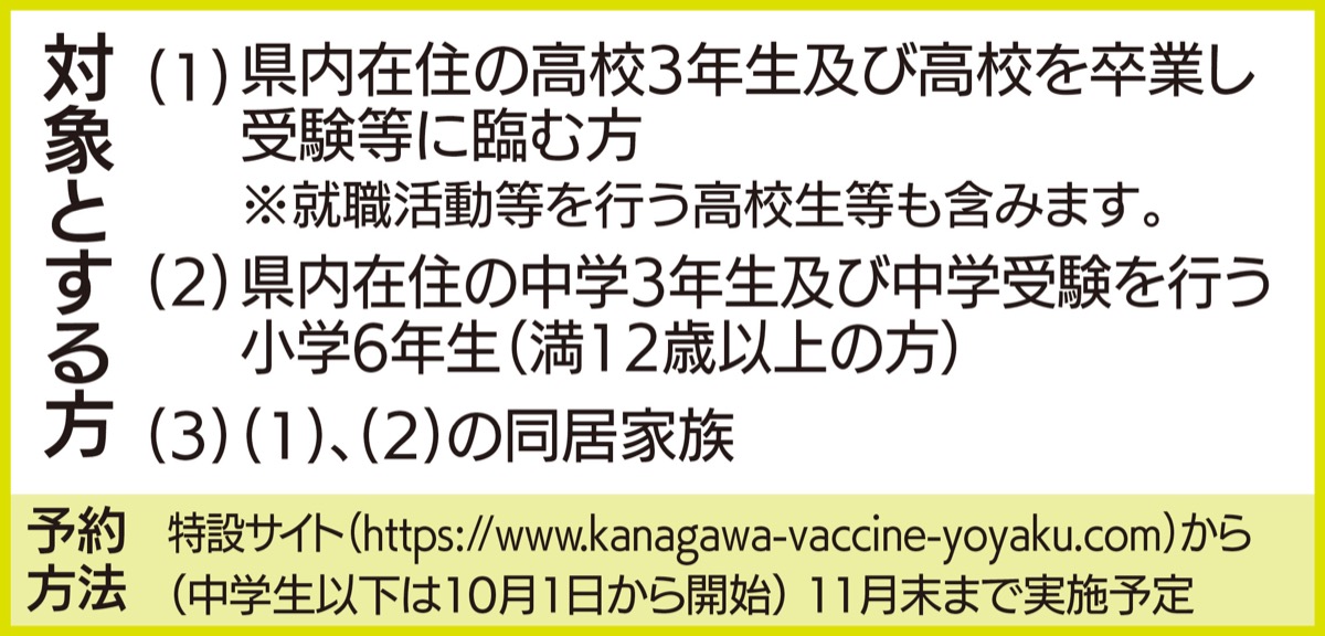 県内在住で、高校3年生及び高校を卒業し受験等(就職活動含む)に臨む方、中学3年生及び中学受験を行う小学6年生(満12歳以上)およびその同居家族が対象です。会場は港北区の新横浜国際ホテルマナーハウス南館、ワクチンはモデルナ社製です。申込みは特設サイト(https://www.kanagawa-vaccine-yoyaku.com)から。