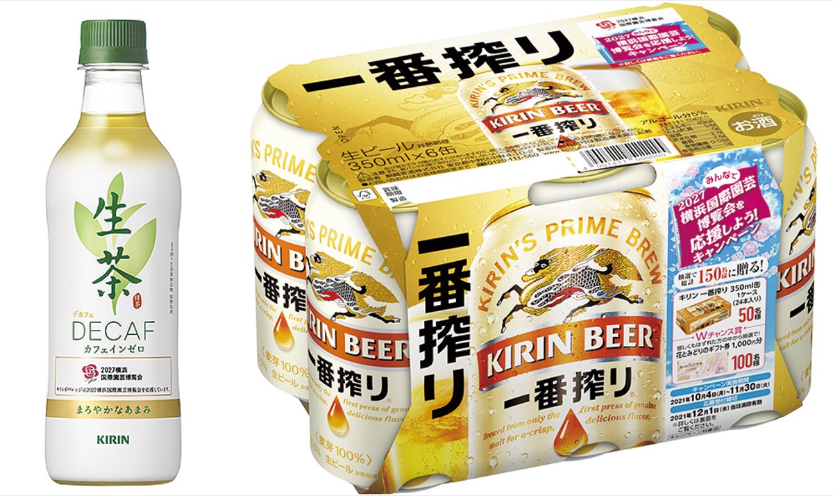 旧上瀬谷通信施設(瀬谷区、旭区)で2027年に開催予定の国際園芸博覧会のPR事業の一環として、園芸博応援デザインの「キリン一番搾り」と「生茶デカフェ」が販売される。