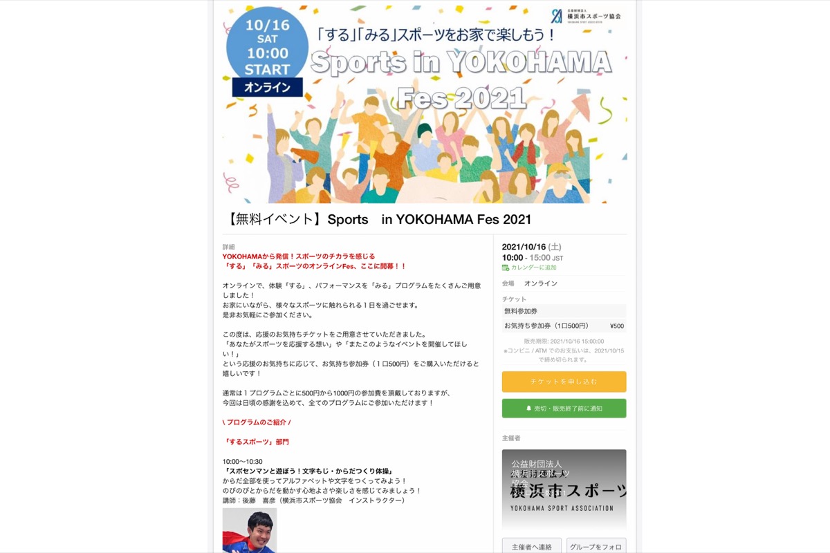 各プログラムの詳細・申込みはイベント管理サービスのPeatix内にある公式サイト(https://sportsinyokohamafes2021.peatix.com/)から。申込み完了後、事前に参加に必要なURLが送信される。