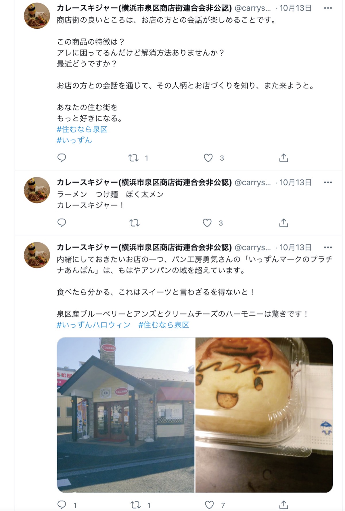 今月31日までのいっずんハロウィン終了後も引き続きツイッターで商店街の魅力を発信していきたいというカレースキジャー。とはいえ18日時点でフォロワー数は14なので、皆さんぜひフォローを!