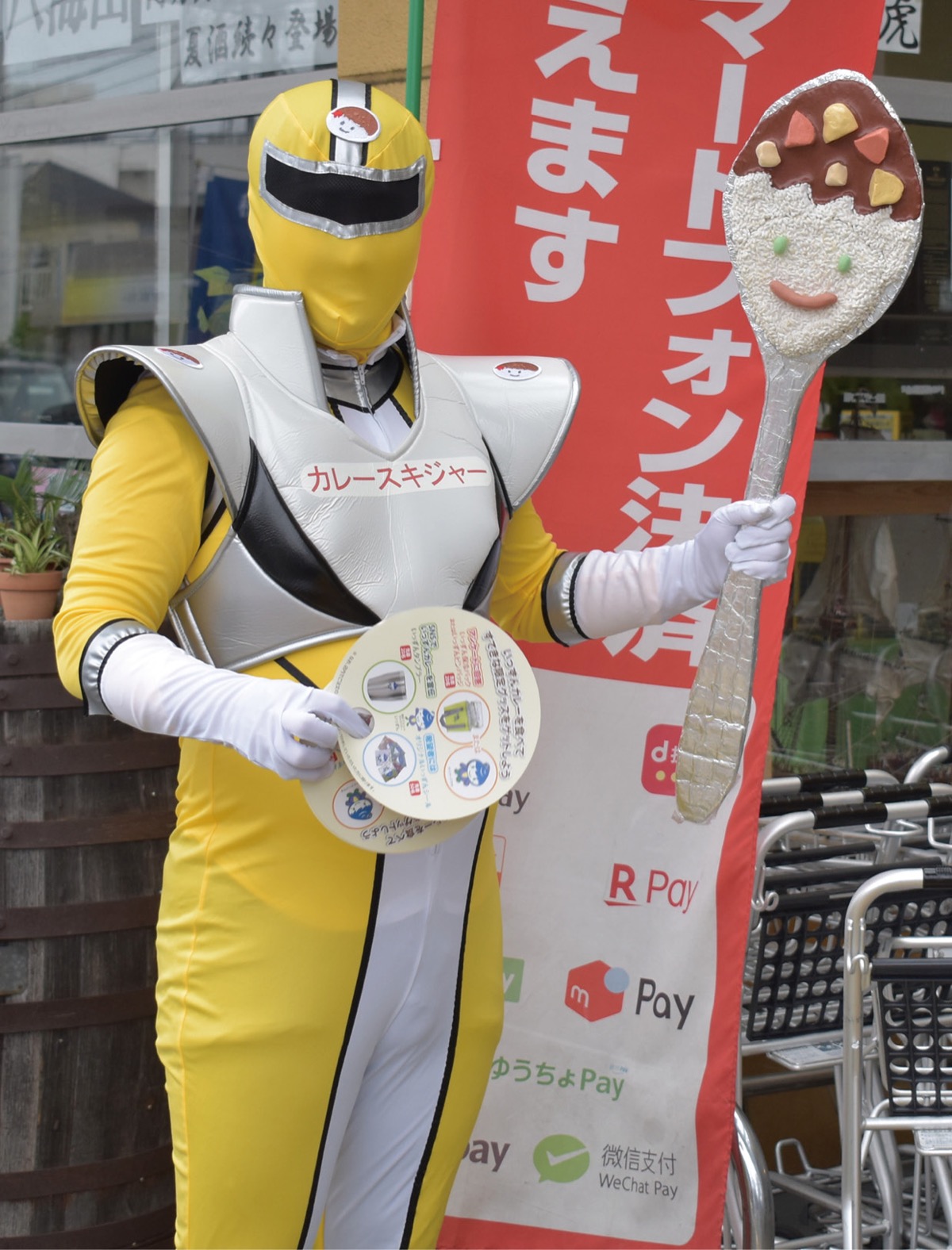 カレー好きを連想させる黄色い戦隊ヒーローのような風貌のカレースキジャー。2019年から夏に実施されてきた「いっずんカレー」の季節になると、どこからともなく登場しイベントをPRしている。