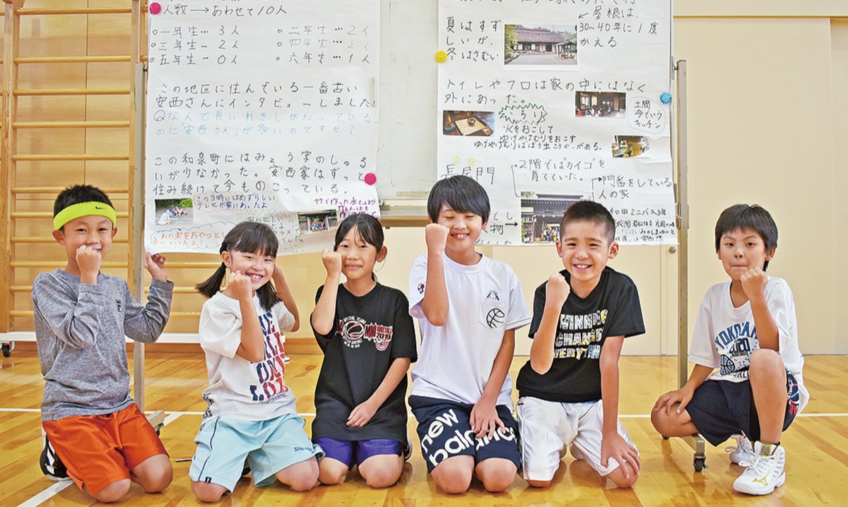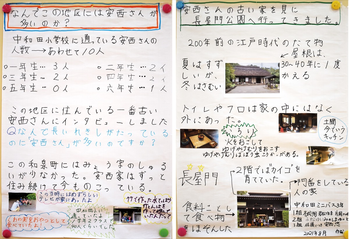子どもたちが通う中和田小には「安西」姓の児童が多いことに気付き、その理由を夏休みの宿題として調査することに。3年生の仲良し7人組で役割を分担し、児童名簿から安西姓の人数を調べたほか、学区内で一番古くから住んでいる「安西さん」にインタビュー。長屋門公園=瀬谷区=に移設された、江戸時代中期に建てられたとされている安西家の母屋を見学し、その様子を模造紙2枚にまとめた。