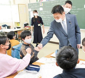 葛野小学校(石塚直実校長)に11月8日、末松信介文部科学大臣が視察に訪れた。教育現場や研究施設の視察の一環で、理化学研究所、海洋研究開発機構と併せて同校を訪問した。
