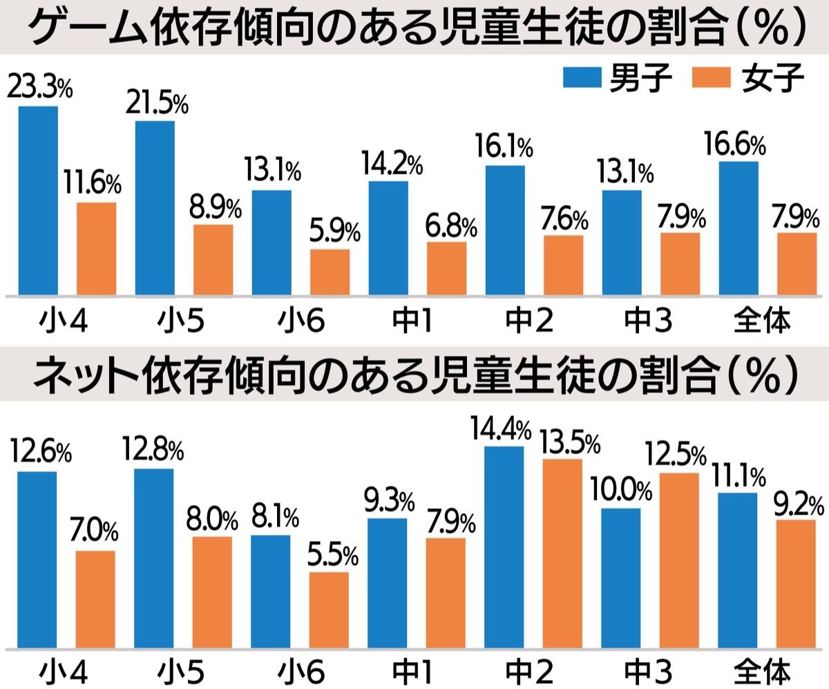 ゲーム依存症傾向の児童生徒は全体の8・9%。「オンラインゲームをしたことがある」と回答した児童生徒はさらに割合が高くなり、12・6%に依存傾向が見られた。男子の割合が高く、特に小学4、5年生の男子では2割を超えた。