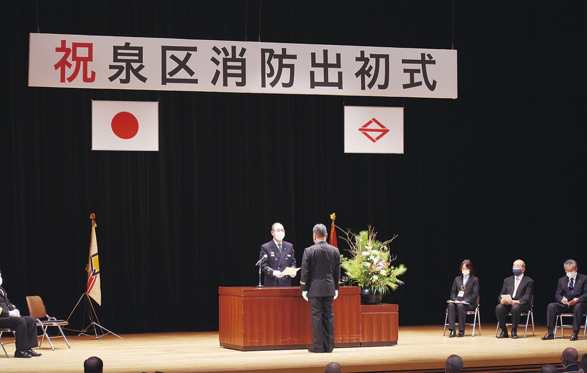 新型コロナウイルスの影響で2年ぶりの開催となった泉区消防出初式が1月8日、泉公会堂で開かれた。