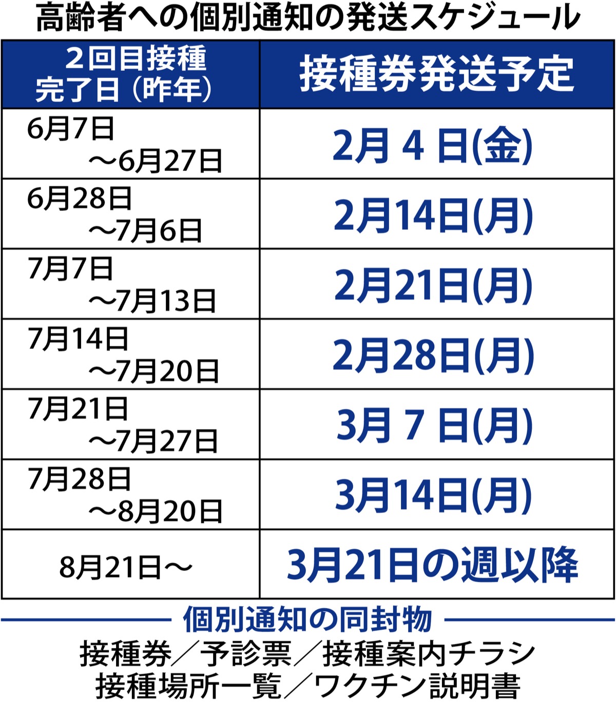 前倒しの対象となる高齢者は約86万人。2月4日に発送されるのは昨年6月27日までに2回目の接種を受けた人で、早ければ2月7日に予約することができる。その後、2月14日から毎週月曜日に順次接種券を発送する計画。昨年7月28日から8月20日までの期間に2回目の接種を受けた人の場合、3月14日に発送される。
