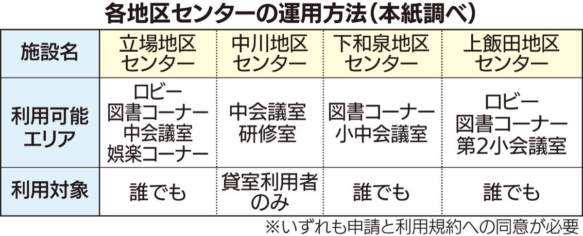 泉区では各地域の住民からなる団体が指定管理者として地区センターの管理を行っていることも、各館独自の対応となる要因。区民利用施設を管轄する泉区地域振興課では「施設の実情に応じて対応は異なるが、利用者の声を聞きながら運用方法を見直していって頂ければ」と話した。