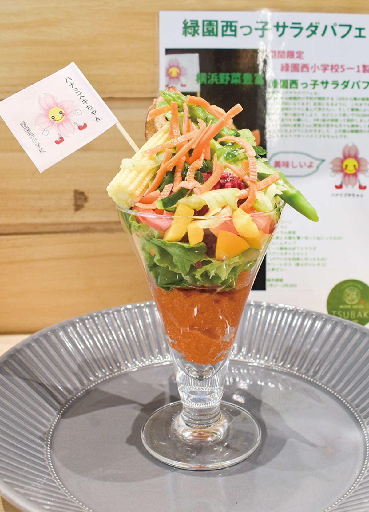 緑園西小学校5年1組の児童が提案した「サラダパフェ」が、横浜市庁舎=中区=2階の商業施設内にある「TSUBAKI食堂」で2月28日までの限定メニューとして提供されている。4月の義務教育学校開校に伴い閉校する同校の記念になればとの思いが込められている。