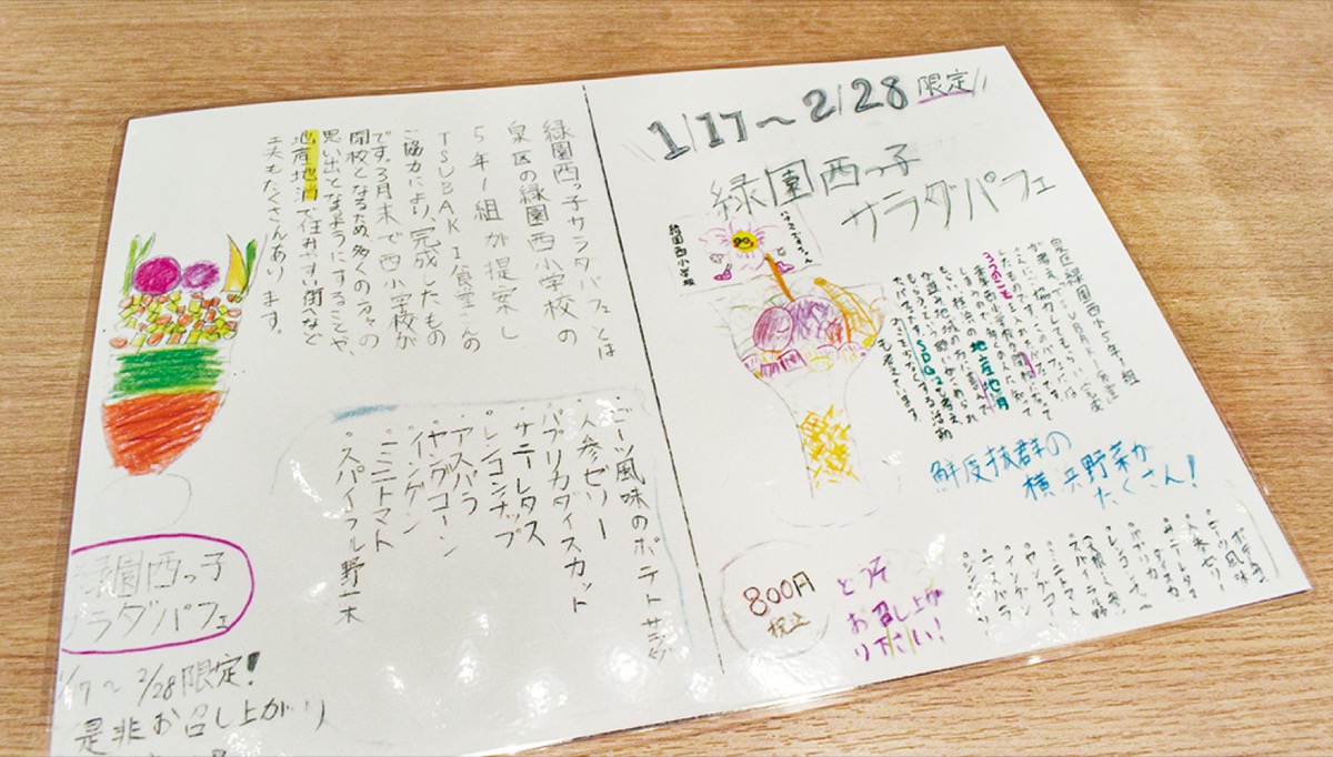 1月17日から提供を開始。店内には児童が描いた同メニューの解説イラストも置かれている。深沼教諭は「子どもたちが考えたことが実現できて感謝します。閉校前に形になってよかったです」と話す。椿さんは「打ち合わせを進める中で子どもたちの想いを感じ、その熱量に応えたいという思いでメニュー化しました。3月で閉校する緑園西小の思い出の一つになれば」と想いを語った。