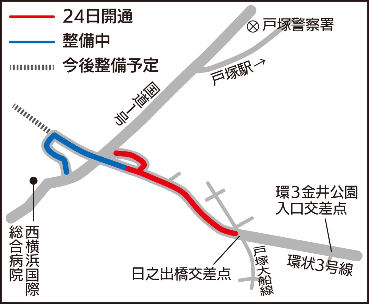 環状3号線が戸塚区戸塚町の日之出橋交差点から北西に向かって新たに開通し、国道1号下り線と接続する(地図参照)。開通は本日3月24日の午後2時。これにより、磯子区の国道16号から国道1号下り線が1本の道でつながる。