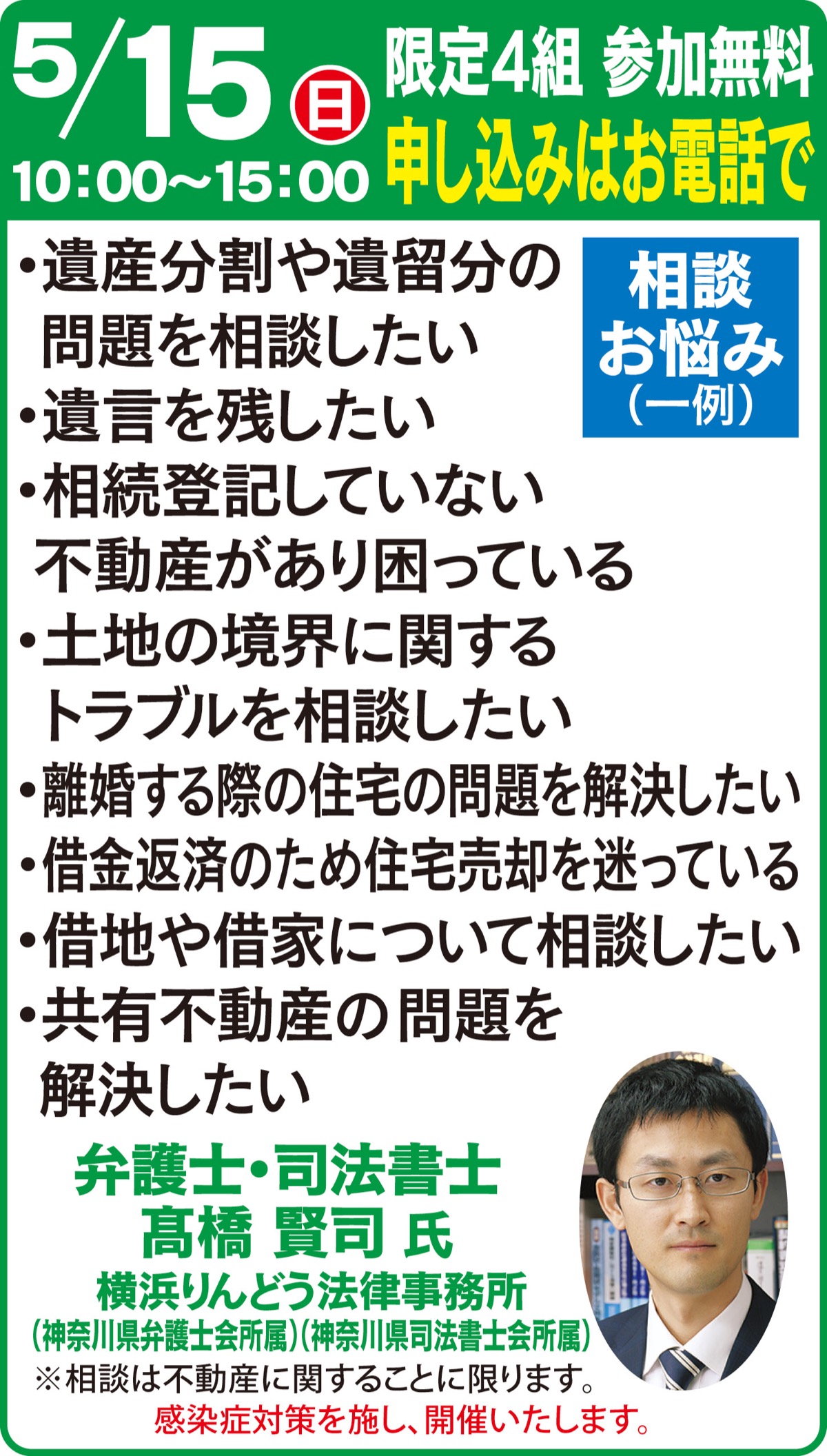 相鉄不動産販売・緑園都市店では、弁護士による相続・不動産の無料個別相談会を5月15日(日)に行う。相談を受けるのは弁護士・司法書士の高橋賢司氏。相続や債務整理、離婚時の財産分与などを中心に、不動産に関する多くの相談を受けており「今まで悩んでいた問題が解決できた」など参加者から好評だ。