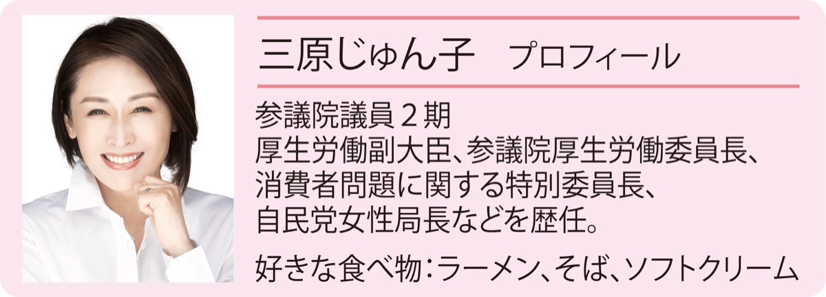 三原 私は女優として活動していた2008年、44歳の時、何気ない気持ちで受けた人間ドックで子宮頸がんが見つかり手術しました。当時、「生きているだけでもありがたいと思ってください」と告げられましたが、病床で気持ちがリセットされ、「これからの人生は今までとは違う。わがままに生きてきたけど、これからは人のために生きる生き方をしたい」と考えるようになり、がんと闘っている多くの人たちをはじめ、主に病気や様々な悩みで苦しんでいる方々のために人生を捧げようと、女優引退・参院選への立候補を決意し、皆さまのお陰様で自民党の参議院議員として二期目の仕事をさせていただいています。