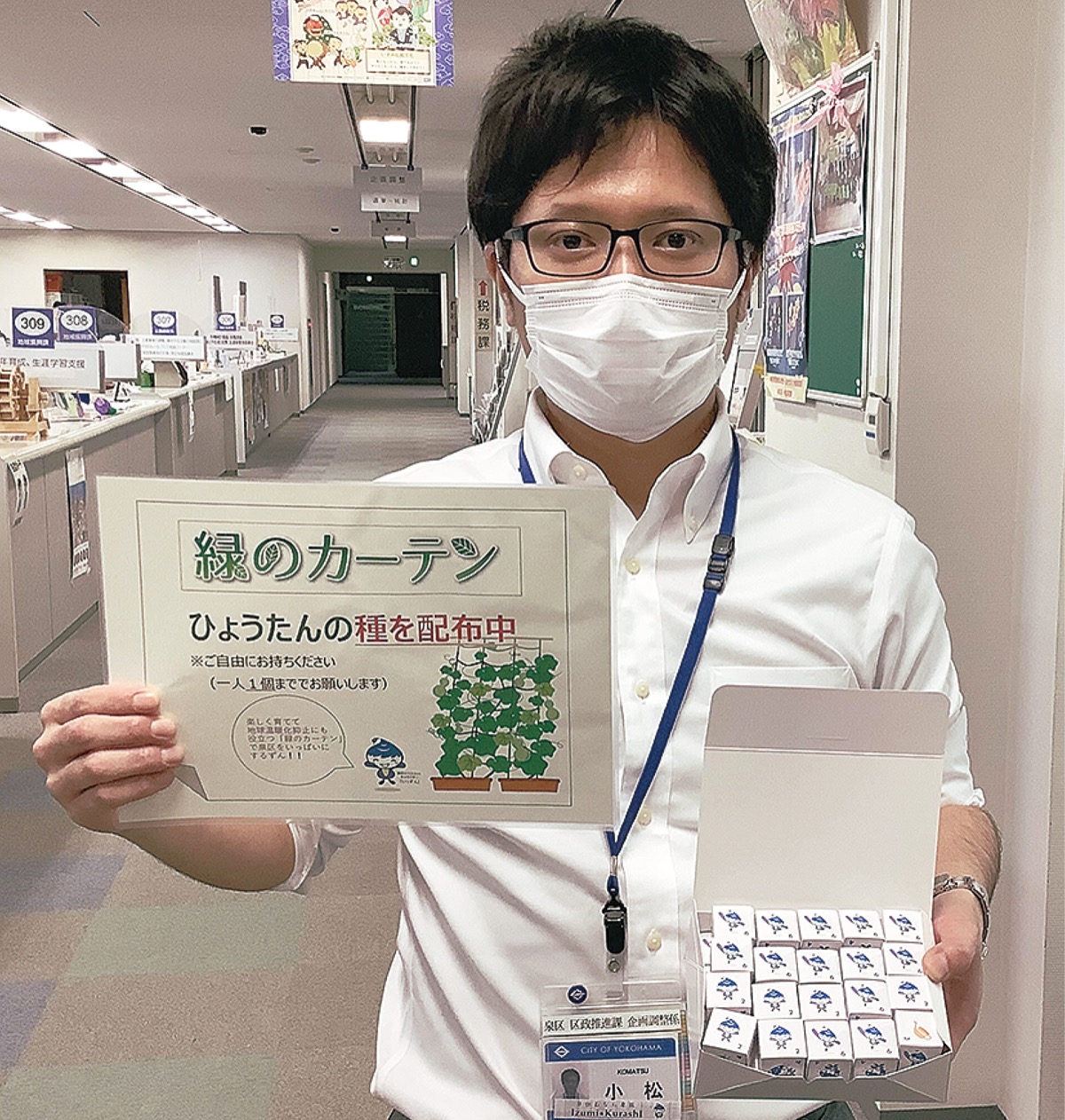 配布場所は区役所1階の総合受付と3階の区政推進課窓口。多数をまとめて欲しい場合も相談に応じる。担当職員は「種まきを終えた後もサイコロとして楽しんでもらえるように箱のデザインも可愛いので、気軽に緑のカーテンづくりに挑戦してもらいたい。実ったひょうたんは置物としても楽しめます」と話している。