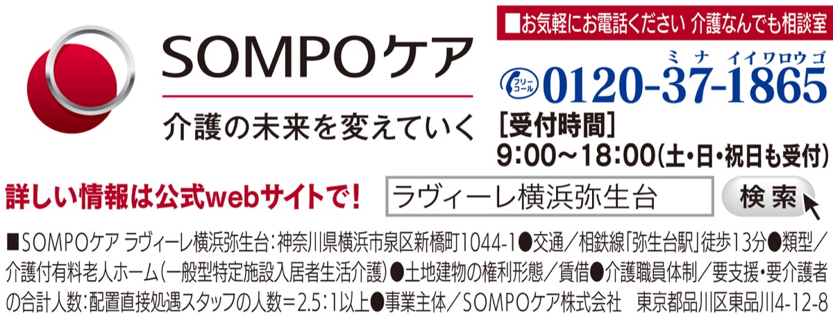 「SOMPOケア ラヴィーレ横浜弥生台」は、建物中央に配した中庭と吹抜けから降り注ぐ陽光が印象的な明るく高級感漂うホーム。四季折々に表情を変える里山。豊かな実りを楽しめる果樹。そんな自然に囲まれた閑静な住宅街に位置する。轟ホーム長をはじめとしたベテランのスタッフと若いスタッフが協力し合いホームを支えている。全居室には睡眠センサーを装備し、睡眠中の健康チェックもできる。ホーム内で調理する美味しい食事は、栄養面や食べやすさはもちろん、こだわりの食材を用いた多彩な行事食も魅力。また、アクティビティのメニューも充実している。ショートステイの利用可能。6月18日(土)・19日(日)には「試食付き内覧会」を開催する。ホームの詳細や雰囲気を体験したい人は連絡を。