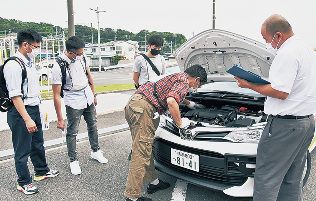 8回目となる今回は、各区の会員事業所から18人が参加。4つのグループに分かれ、横浜自動車学校の指導員からアドバイスを受けてタイヤやエンジンルームなど車両の日常的な点検の順序や方法などを学んだ。