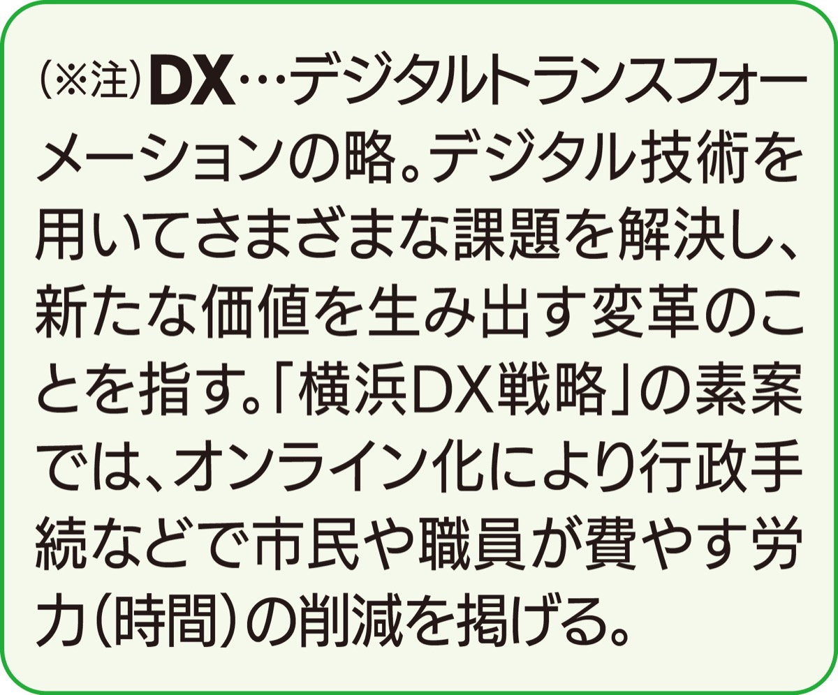 (※注)DX…デジタルトランスフォーメーションの略。デジタル技術を用いてさまざまな課題を解決し、新たな価値を生み出す変革のことを指す。「横浜DX戦略」の素案では、オンライン化により行政手続などで市民や職員が費やす労力(時間)の削減を掲げる。