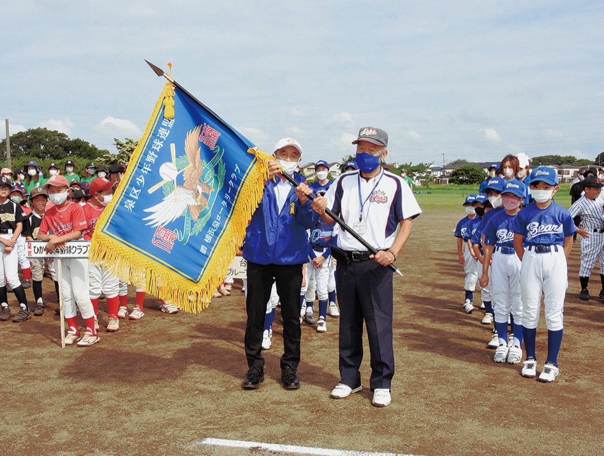 奉仕団体の横浜泉ロータリークラブ(RC)が6月12日、泉区少年野球連盟に優勝旗、準優勝カップ、3位カップを寄贈した。この日、深谷通信所跡地のグラウンドで開かれた「第22回親子ふれあいトスベースボール大会」に合わせたもので、同大会には13チームが出場。保護者もあわせて247人が参加し、汗を流した。