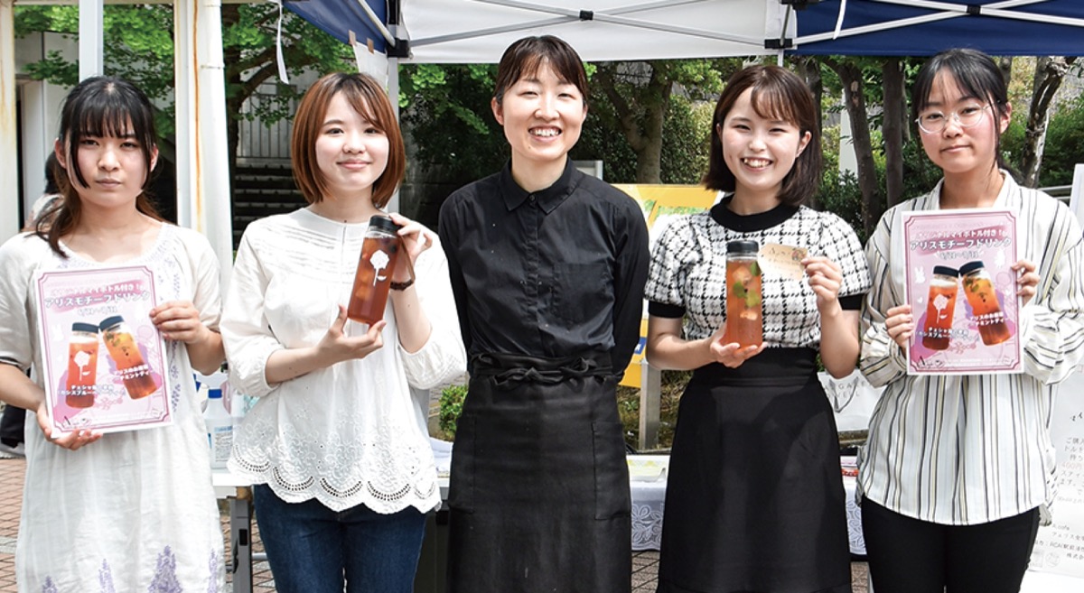 販売しているのは同研究会メンバーが大学構内で栽培したミントを使った「アリスのお昼寝ピーチミントティー」と、門倉農園=戸塚区名瀬町=で収穫したブルーベリーとカシスの果肉が入った「チェシャ猫の悪戯カシスブルーベリーティー」の2種。同大学のイメージフラワー・バラをデザインしたボトルと、ハートで第2ボタンを表現したデザインのボトルに入れて提供する。価格は1本650円。空のボトルをA.cafeに持参すると400円で”おかわり”ができる。