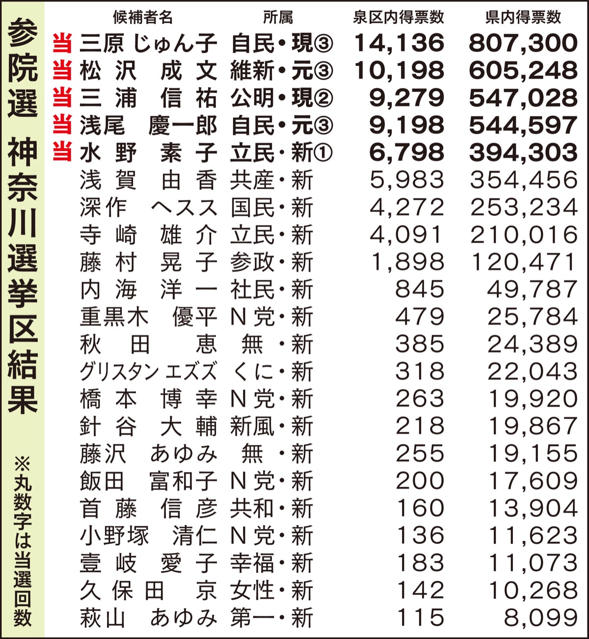 参議院議員選挙の投開票が7月10日に行われた。改選4と欠員補充1の計5議席を過去最多の22人で争った神奈川選挙区は、自民党の現職・三原じゅん子氏(57)が約80万7千票を獲得し、トップ当選。以下、日本維新の会の元職・松沢成文氏(64)、公明党の現職・三浦信祐氏(47)、自民党の元職・浅尾慶一郎氏(58)、立憲民主党の新人・水野素子氏(52)が当選した。