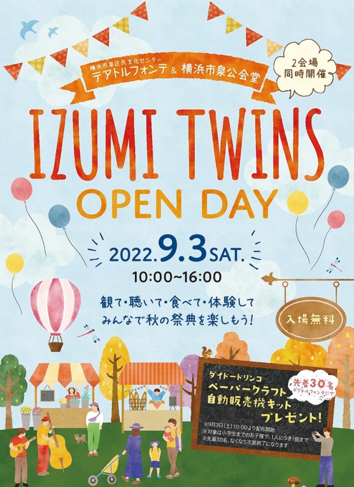 泉公会堂と泉区民文化センター「テアトルフォンテ」の初の合同イベント「IZUMI TWINS(イズミツインズ) オープンデイ」が9月3日(土)に開かれる。両施設ではコンサートや、雑貨や野菜の販売などを企画しており、「文化の発信拠点として、泉区の良さを再発見してもらえたら」としている。