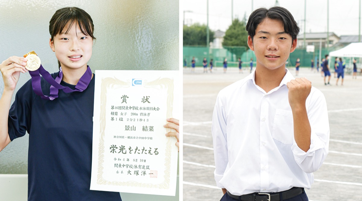 水泳部の景山結菜さん(2年)は第46回関東中学校水泳競技大会に出場し、女子200メートル背泳ぎで1位に。また野球部の八木隼俊君(3年)は市の選抜チーム「横浜クラブ」の一員として、第12回東日本少年軟式野球大会優勝に大きく貢献した。
