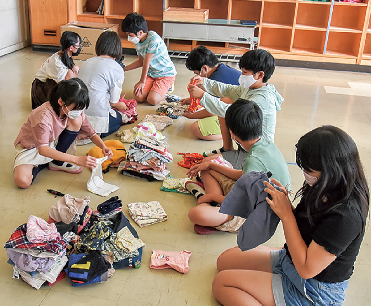 児童は出前授業の後、ポスターや回収ボックスを製作し、夏休み明けに各所に設置。現在は週1回程度回収を行っている。回収後には校内でサイズ、季節、種類別に仕分け。ポケットの中身確認や服に書かれた英単語の意味までチェックし、不適切なものは除外しているという。