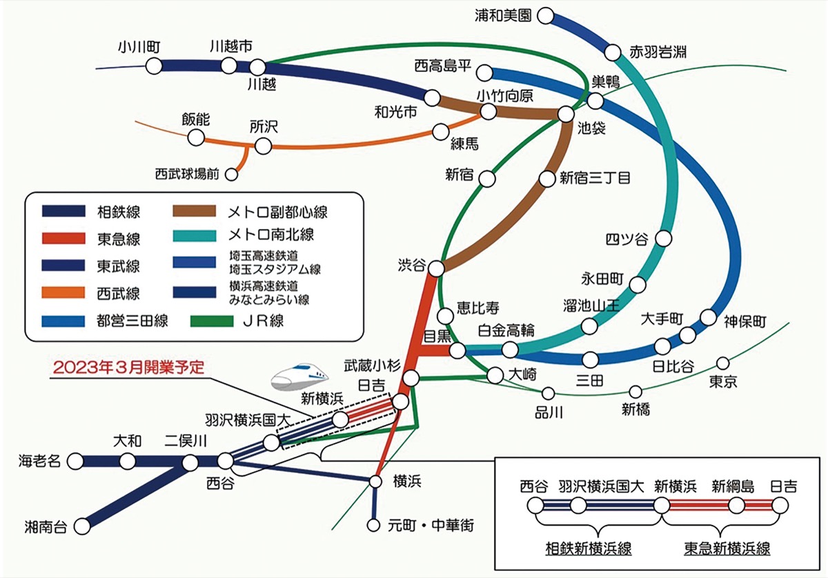 「相鉄本線・いずみ野線、東急東横線・目黒線に接続し、東京メトロ南北線・副都心線、都営三田線、埼玉高速鉄道埼玉スタジアム線、東武東上線まで直通運転を行います。具体的な行き先の駅は検討中です」