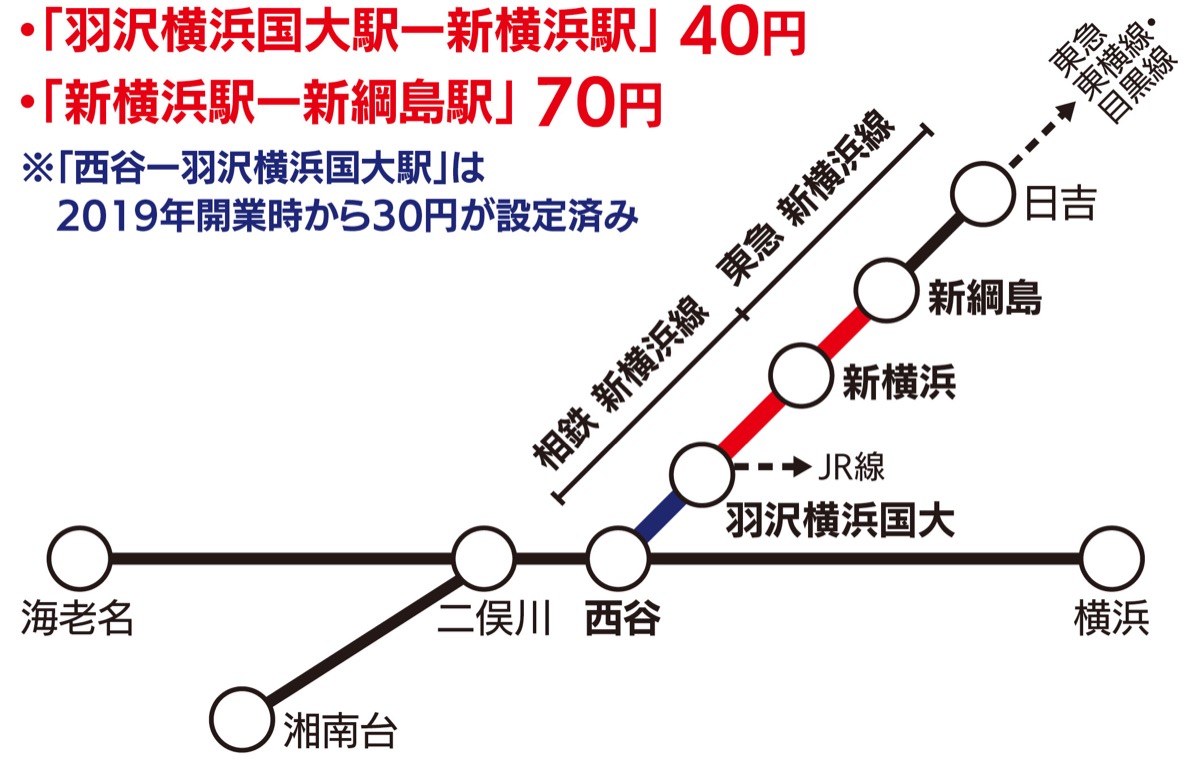 今回認可された運賃は、相鉄線と東急線の基本運賃に、加算運賃が加わったもの。加算運賃は新線建設時など設備投資に充てるため、特定の区間の運賃に一定の額を加算する制度。新横浜線建設に際し、相鉄線ではすでに開通している「西谷駅―羽沢横浜国大駅」で30円が設定されているのに加え、「羽沢横浜国大駅―新横浜駅」に40円が上乗せされる。また、東急線では「新横浜駅―新綱島駅」に70円が設定されており、相鉄本線から新横浜線経由で都心方面に向かう場合、基本運賃に加え合計140円の加算運賃の負担が必要となる。