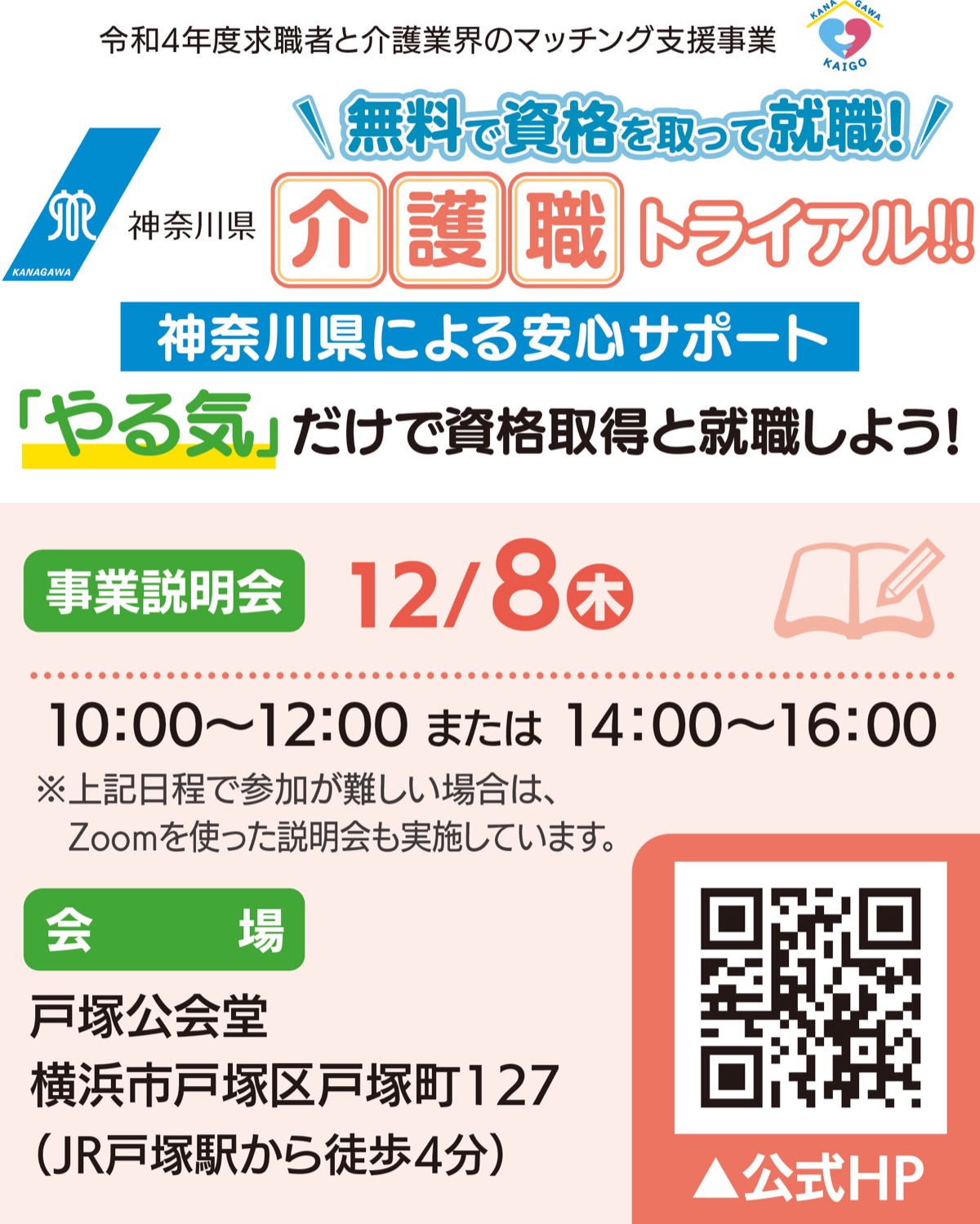 神奈川県では、介護資格の取得と、介護施設への就職をサポートする「介護職トライアル」を実施中。現在、説明会の参加者を募集している。