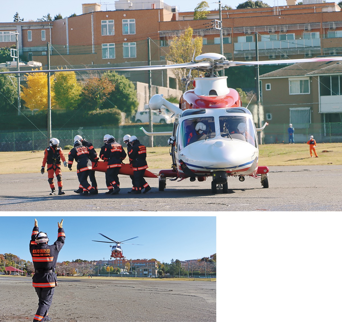 和泉町のJAみなみグラウンドで11月27日、泉消防署と泉消防団が航空消防隊と連携してヘリコプターの離着陸訓練を実施した。