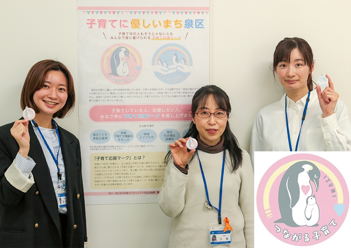 「このマークを通じて、子育てにやさしいまち泉区を進められたら」――。泉区福祉保健センターこども家庭支援課が作成し、現在配布中の「子育て応援マーク」がじわじわと広まりを見せている。子育て中の人、子育てを応援したい人の双方が身につけることで、「地域での子育てがつながるきっかけになれば」と職員も期待を込める。