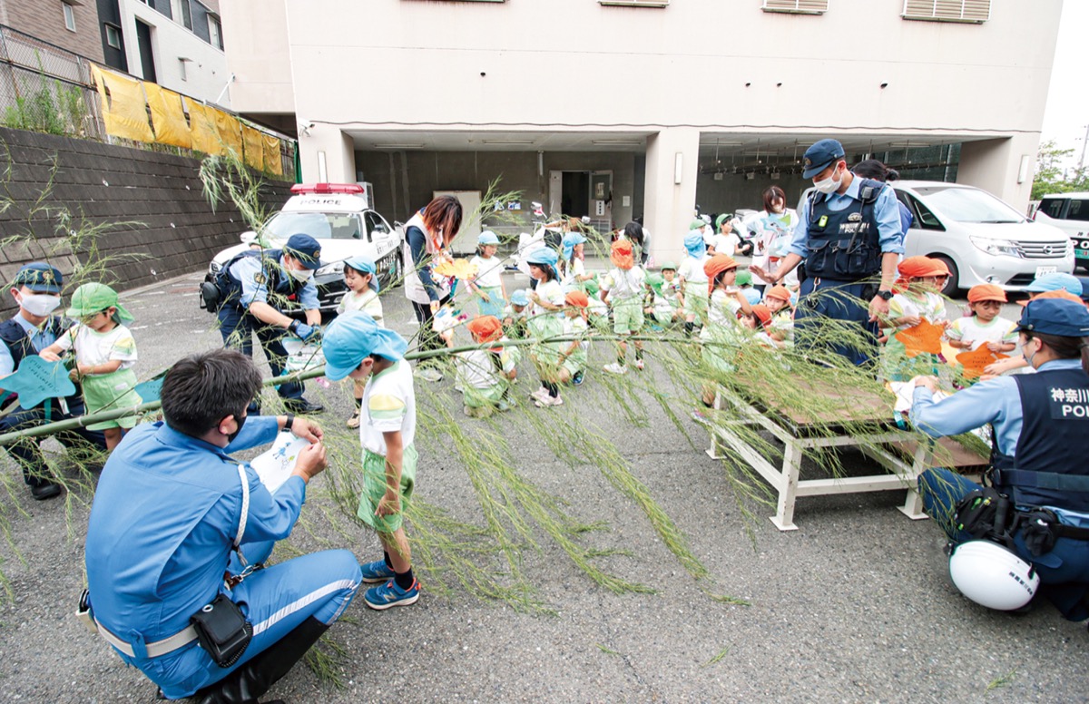 「じこがおきませんように」「どろぼうがいなくなりますように」――。和泉中央北の平和幼稚園(安西透園長)の年長園児約60人が6月19日、泉警察署を訪れて署員と交流しながら七夕の飾りつけをした=写真。