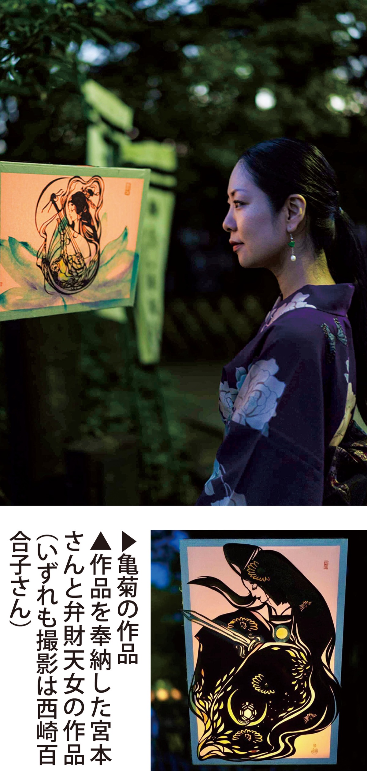 和鋼の小刀を使った切り絵「刀絵」の作家として広く活躍している宮本さん。この祭りにはゆかりのある著名人などが手がけた書画約400点がぼんぼりとして参道に並ぶなか、宮本さんは例年作品を納めて人気を集めている。