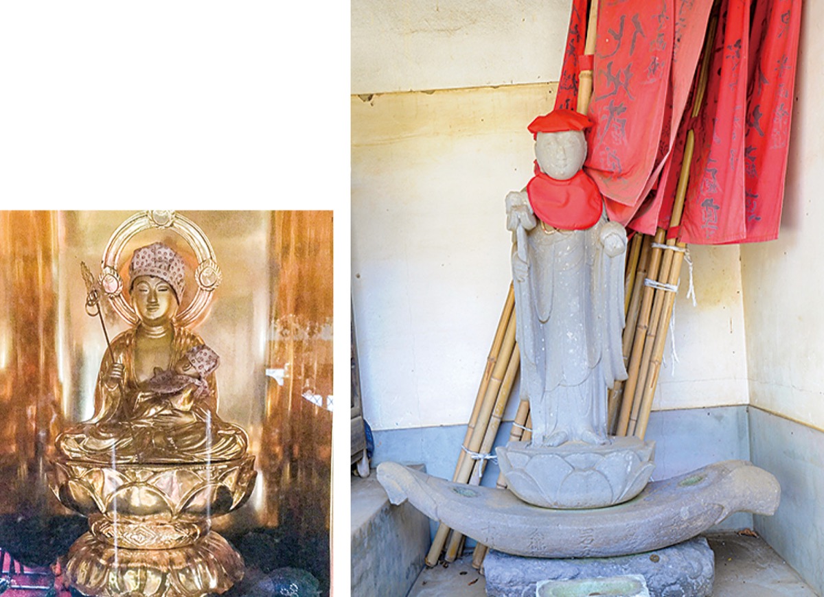 境内には子宝・子育てに謂れのある岩舟地蔵尊、廻化地蔵尊がある。子宝地蔵と呼ばれる岩舟地蔵尊は長さ1mほどの石の舟の上に立ち、享保年間(1719年ころ)に下野国岩船山(栃木市)の高勝寺より伝えられたという。また木彫りで金塗りの廻化地蔵尊は、安永(1772〜1780)の頃、伊勢原市の保国寺で廻り地蔵が作られた記録があり、そのうちの1体とも言われているという。