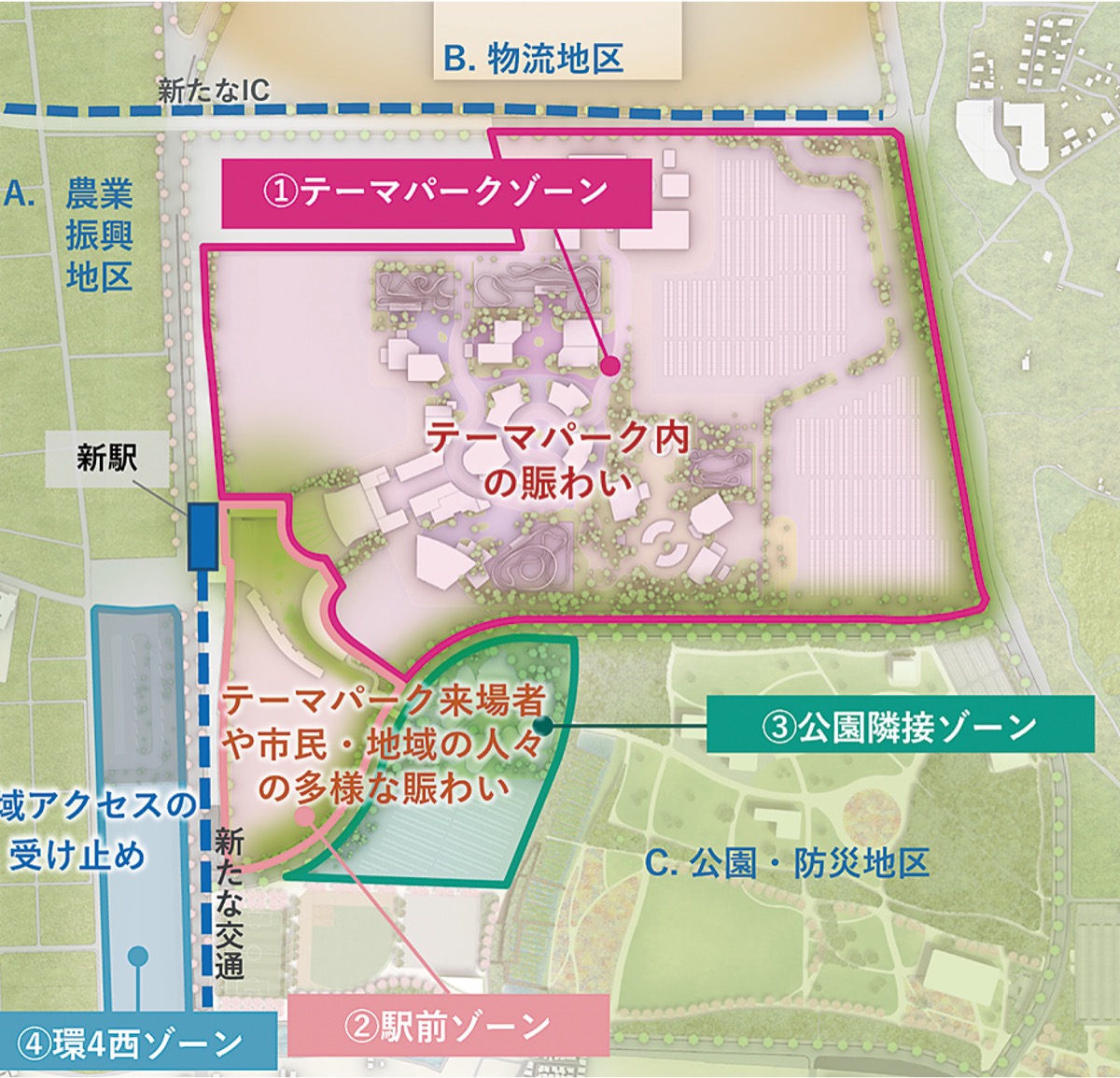 同社の提案概要によると、同地区を「KAMISEYA PARK」(仮称)と銘打ち、次世代型テーマパークを核とした街づくりが展開される。敷地面積は約70ヘクタールで、テーマパーク(約51ヘクタール)、駅前(7ヘクタール)、公園隣接(約6・5ヘクタール)、環4西(5・7ヘクタール)の4ゾーンに分け整備される計画。
