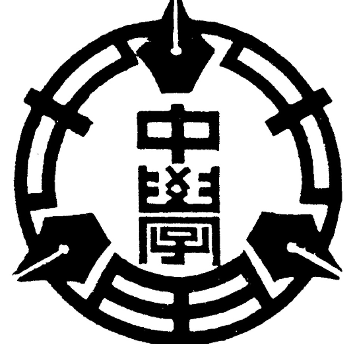 創立年度に生徒から作品を募り、補作して作られた中田中学校の校章。「中田中」の文字が外周を囲んでおり、3本のペンはそれぞれ、勤勉・忍耐・健康を象徴しているという。またペンが外側を向いており、未来に向かって飛躍する姿を、大きく世界へ向けて羽ばたき、社会のため貢献することを願いデザインされたものという。