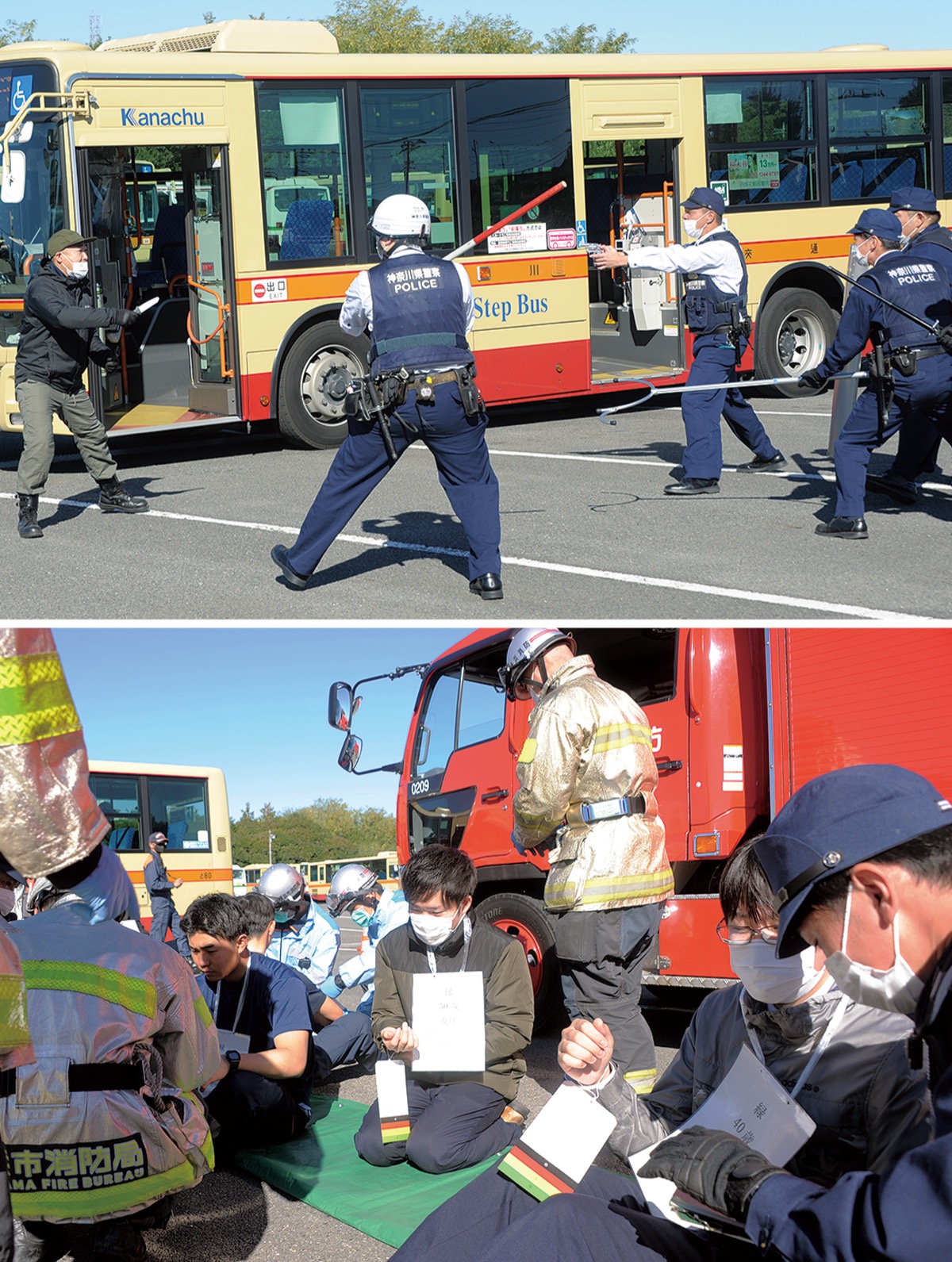 上飯田町の神奈川中央交通(株)戸塚営業所で11月19日、同社と泉消防署、泉警察署合同のバスジャック訓練が行われた。訓練が始まるとバス運転手は緊急事態を知らせる表示を出し、通報を受けた警察車両が追従しながら停車させ、警察が被疑者を確保。乗客らの救出の後、消防・救急隊による負傷者のトリアージ、搬送など各署、企業の役割、連携などを確認し合った。