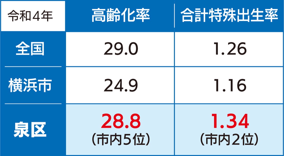 泉区では高齢化率が高く、市内5位の高さを誇ります。一方、子どもが産まれてくる数値の「合計特殊出生率」は市内2位の高水準であり、全国平均をも上回る高さです。本来なら高齢化率が上がれば、子どもは産まれにくくなるので出生率は下がります。相反する関係にある2つのデータから常識ではあり得ない「高齢者が多い、子どもも多い」という「泉区二刀流」が判明しました。