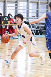 試合=写真=が始まると松陽は相手の連続得点をゆるし、第1Q(クオーター)を12対24で終える苦しい立ち上がり。第2Qからリズムを取り戻したが、前半を28対41で折り返した。第3Qは優位に進めて8点差にまで縮めるなどチャンスも作ったが、3点シュートなどで再び突き放され、53対69で敗れた。