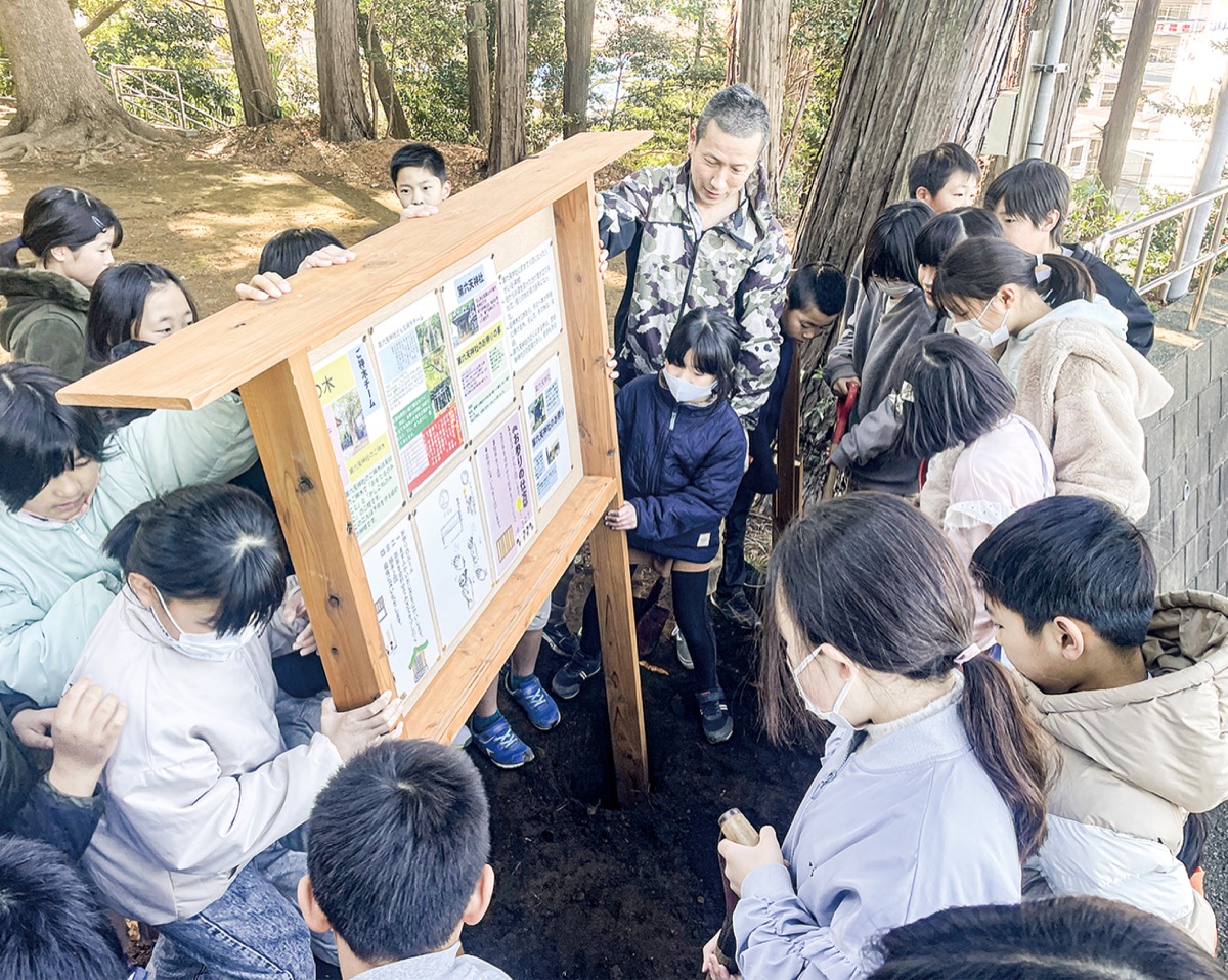 下和泉小学校4年2組の児童が1月25日、地元の第六天神社に縁起などを紹介する立て看板を設置した。