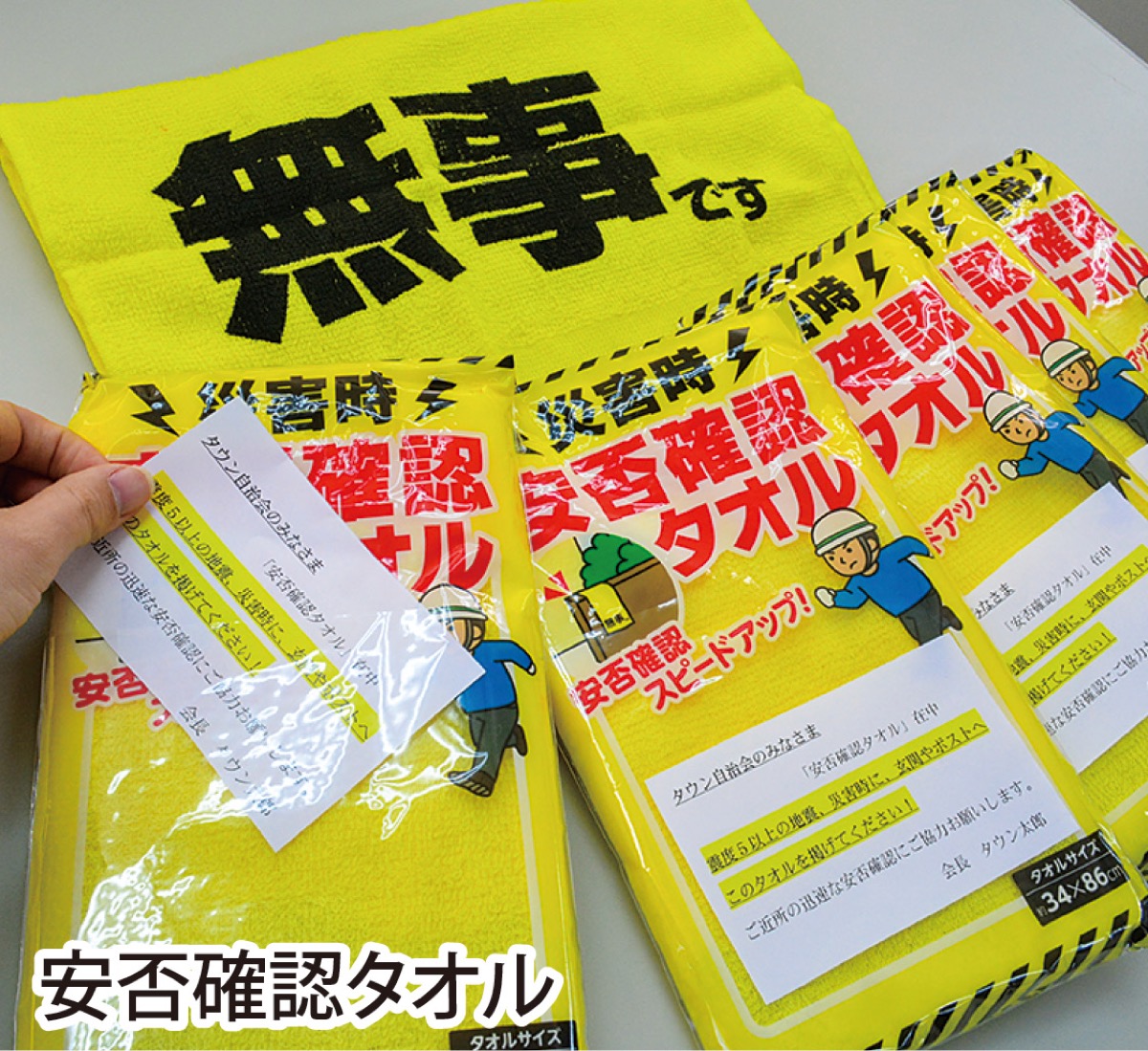 中でも、災害時に玄関先などに掲示して住人の無事を知らせる「安否確認タオル」は、地域の防災意識を高める注目グッズ。安否確認にかかる手間と時間を省力化し、貴重な人手を必要な場所に回すことができる。近年では自治会や市町村が住民に配布し、タオルを活用した防災訓練を行うなど全国的に広がりを見せている。安否確認タオルを含め、掲載グッズの注文は電話1本で可能だ。