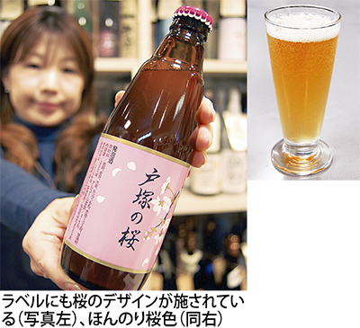 昨年から春季限定で販売しており、桜の酵母は一昨年のものを培養させて使用している。色はほんのりと桜色。桃の香りを付けており、苦味が少ないため、「ビールが苦手な女性にもおすすめ」とのこと。