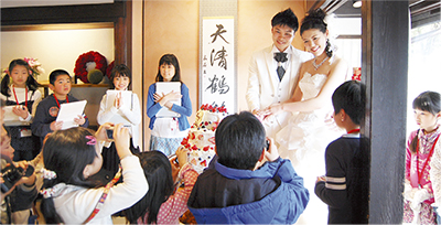 名瀬町にある結婚式場「久右衛門邸(きゅうえもんてい)」で3月31日、ウェディング体験イベントが開催され、区内外の親子50組以上による手づくりの結婚式が行われた。
