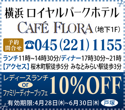 横浜ロイヤルパークホテル地下1階にある『カフェ・フローラ』は知る人ぞ知る穴場的カフェ。明るく開放的な店内で、オードブル、メイン、デザートまで一通り楽しめる月替わりのレディースランチ(1,785円)がおすすめだ。5・6月は初夏のピクニック日和にぴったりなお弁当仕立てのバスケットランチが登場!