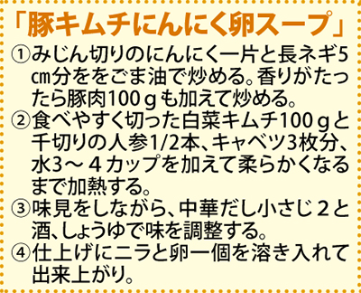 ビタミンB1は水溶性ビタミン。不足しがちになるのは身体の中に蓄えることができないのも一因で、毎日の食事から摂取する必要があります。ビタミンB1の吸収率をアップさせるアリシンとの最強コンビの組み合わせも効果的。アリシンは、にんにくやネギ類、しょうがなどの刺激性のある香りの正体。強い殺菌作用があるため食中毒の予防にも役立ちます。焼肉やにんにく入りの餃子なども理想的なとり方。にんにく醤油、ネギ味噌などを常備しておくのも良い方法です。※左記にレシピ一例