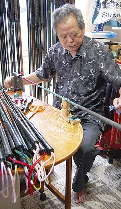 ゴルフ専門店で使用できなくなったクラブを譲り受け、まずはパターを電動機器でカットし、先端にゴムキャップを装着。釣具店からも廃棄された道糸(リールに巻く糸)を提供してもらい、巻きつけてカラフルなデザインに。接着剤を兼ねた透色の漆を塗って仕上げる。製作した杖は10数年で累計1300本。故郷の山梨県笛吹市芦川町や、地元の敬老会などに贈呈してきた。7月27日には、3月にバスツアーで訪れるはずだった北茨城市の詩人・野口雨情生家にも寄付したという。