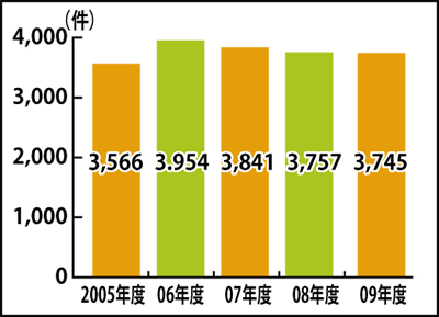 配偶者からの暴力事案認知件数は県内で年々増加傾向にあり、2009年中で2170件にのぼる(県警調べ)。