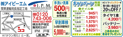 新車・中古車の販売、車検、整備などを行う舞岡町の「(株)アイピーエム」が毎週土曜日限定でキャンペーンを行う。タイヤやバッテリー、オイル交換が特別価格(下記参照)で受けられると大評判。