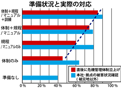 一方、体制や規程・マニュアルの準備に加えて訓練もしていた回答社は全体の約4割。その多くが「訓練が功を奏した」としている。